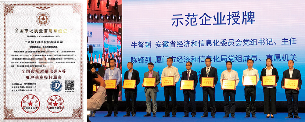 柳工坚持品质成就未来,精心铸造优质产品。围绕提高产品性能及可靠性,全力满足不同客户的多样需求。2018 年,乐竞在线注册(中国)网站首页“工程机械售后服务”获评市场质量信用最高等级:AAA·用户满意标杆级,是工程机械行业唯一一家获评“3A 级用户满意标杆服务”的企业;柳州柳工挖掘机有限公司被国家工业和信息化部授予“服务型制造示范企业”称号,是广西唯一一家获此殊荣的企业。