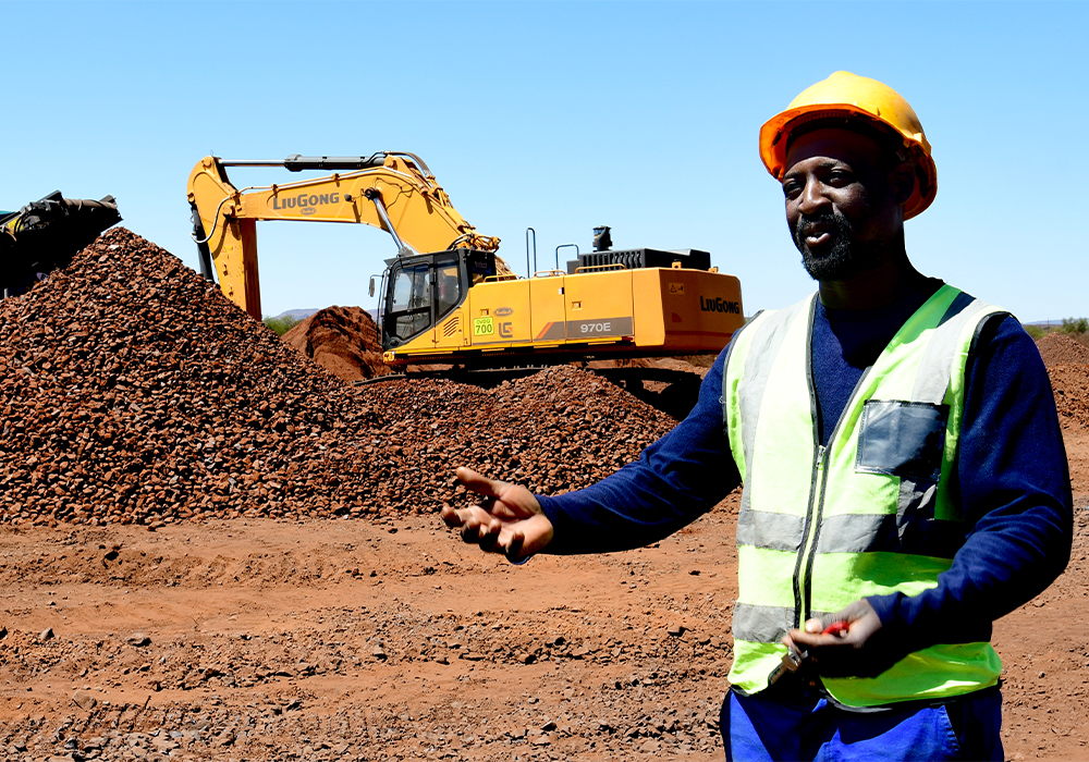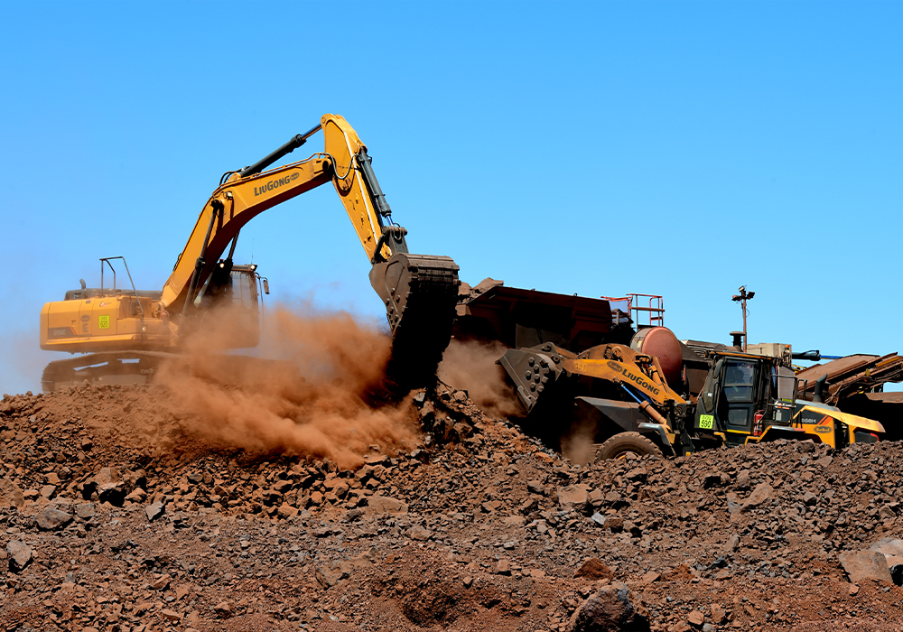 刚入锰矿基地,一大片褐红色的锰矿呈现在我们的眼前。工地安全检查程序严谨,我们在穿戴了劳保防护用品,进行了酒精测试后,开车到了柳工设备作业的现场。该客户于去年采购了包括柳工装载机、挖掘机、平地机和压路机在内的7台柳工设备,这些设备分别遍布于工地的4个开采施工区域。我们首先到达的是柳工970E挖掘机的工作现场,在那里,我们看到970E挖掘机庞大而矫健的身姿,正在忙碌地挖掘锰矿石,接着倒入筛分设备里进行筛分。一挖一倒,动作流畅连贯。