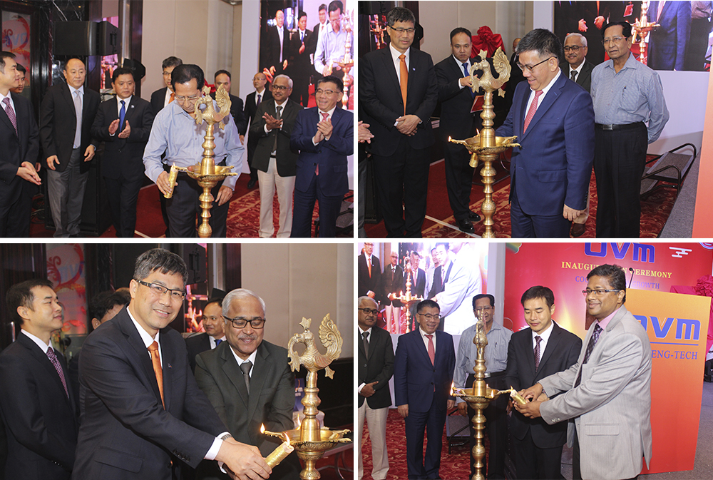 在富有浓郁传统印度特色的燃灯仪式上,年届82岁高龄、有印度预应力行业大师之称的Mr. P. Y. Manjure率先用手中的蜡烛点燃了油灯灯芯,然后其它特邀嘉宾依次传递,分别点亮所有灯芯。点亮的神灯代表着祝福,预示印度欧维姆的明天将更加光明。在热烈的掌声中,柳工集团党委书记、董事长曾光安与Mr. Atul Bhobe(Managing Director of TPF Engineering Pvt., Ltd)共同为印度欧维姆揭牌。